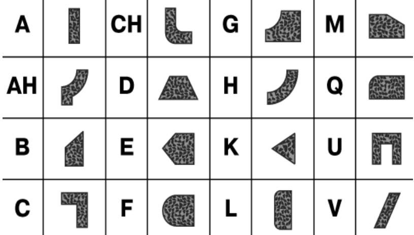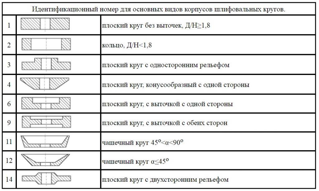 В первую группу признаков по ГОСТ входит пятнадцать видов корпусов, пронумерованных от 1 до 15. Во вторую — двадцать шесть профилей абразивных слоев, обозначенных одной или двумя латинскими буквами. В третью — десять способов размещения абразива на поверхности корпуса, пронумерованных от 1 по 10.