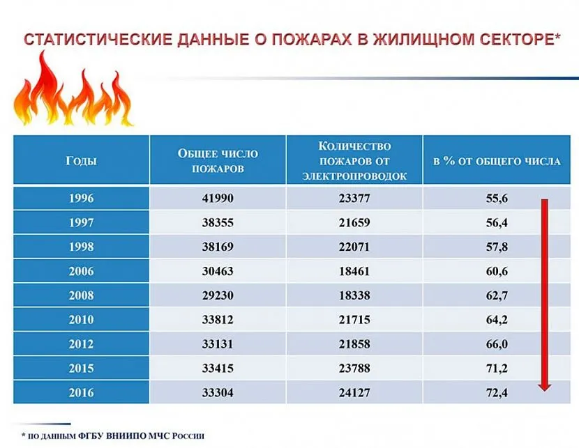 Статистика возникновения пожаров из-за неисправности электропроводкиИсточник Spkab.ru