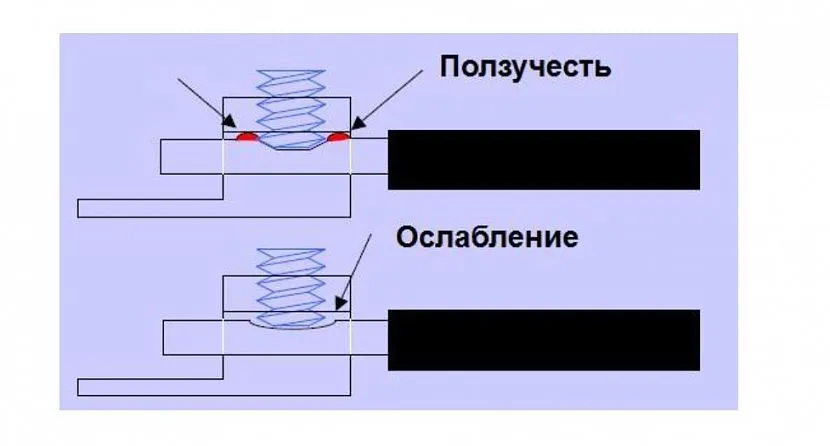 - 5. вследствие более слабого прижатия усиливается нагрев клеммы и процесс повторяется.
