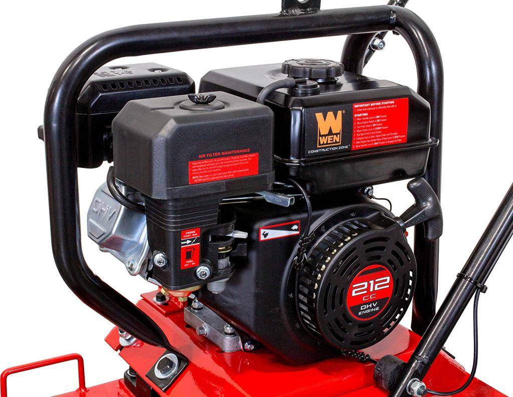 Мощность установленного двигателя должна быть достаточной для работы с тяжелой плитой. Иначе последняя будет грузнуть в сыпучем материале.