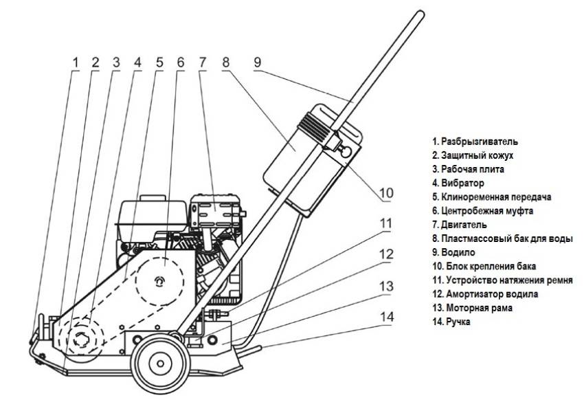 Трамбовка, т.е. виброплита, состоит из пяти главных элементов. Это двигатель, который бывает бензиновым, электрическим и дизельным, и приводит в движение все детали инструмента. Ременная передача помогает отдавать крутящий момент с двигателя на эксцентрик. Тот в свою очередь помогает создавать вибрационные колебания для того, чтобы выполнять трамбовку.