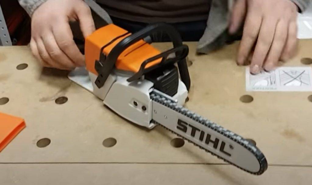 Основная ручка имеет «пусковой крючок» для запуска и верхний рычаг-предохранитель. Чтобы запустить инструмент, необходимо взять бензопилу в руки и нажать два рычага. Около ручки есть специальная площадка, куда необходимо ставить ногу во время запуска.