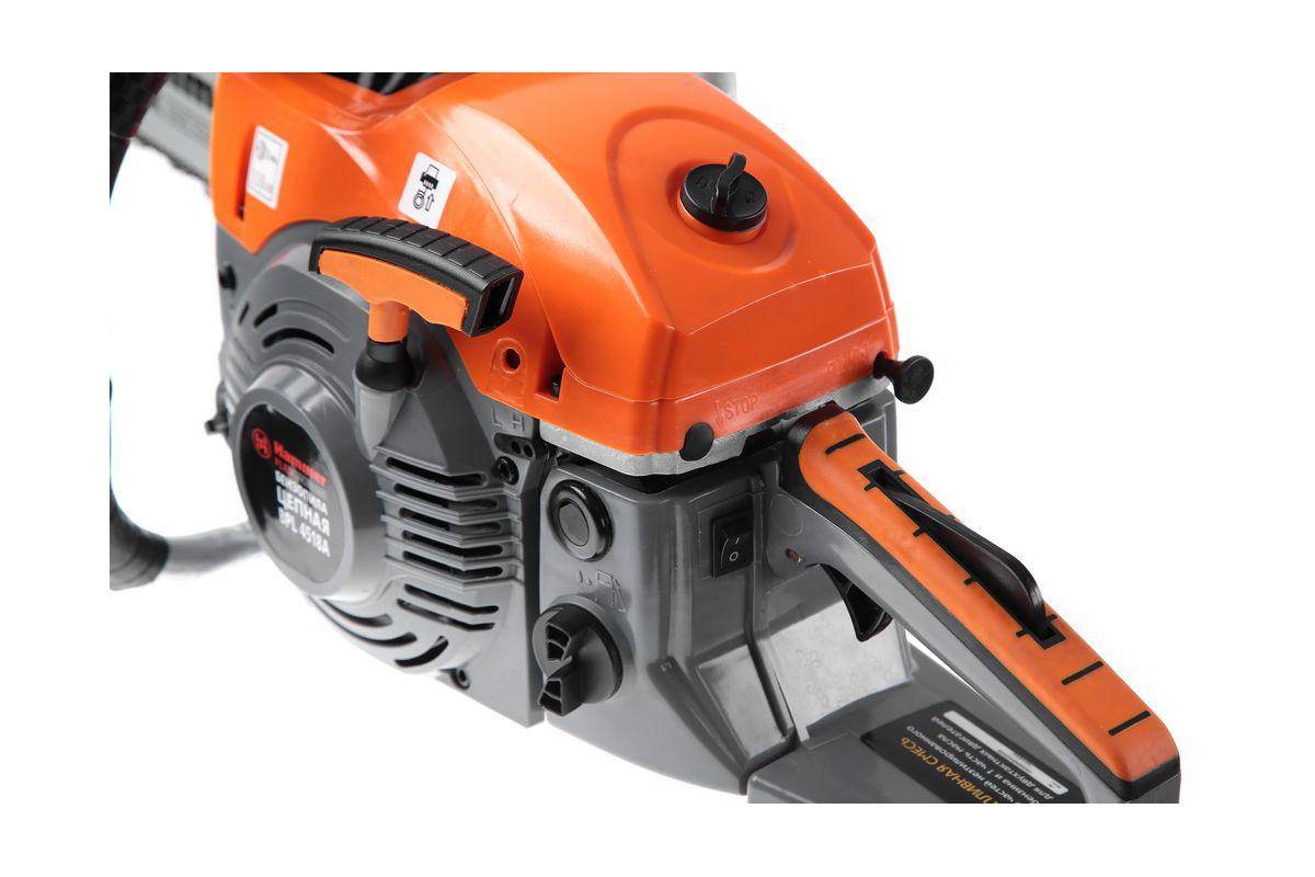 Для максимального удобства, верхняя рукоятка имеет специальную противоскользящую поверхность, что обеспечивает максимальный контроль над бензопилой Hammer Flex BPL4518 104-013. Рядом с рукояткой имеется защитный щиток обратного удара, который включает моментальную остановку цепи.