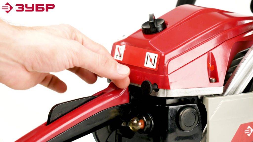 - Пилы Зубр сконструированы по классической схеме, поэтому элементы управления зажиганием и работой двигателя расположены точно так же, как и у других популярных бензопил.