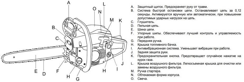 Имеется тормоз цепи, который останавливает прибор в случае отдачи. Работу рычага газа и тормоза нужно проверять перед включением бензопилы.