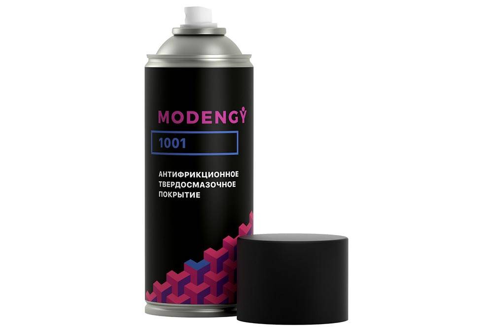 Смазка изготавливается на основе дисульфида молибдена и графита. MODENGY 1001 выпускается в баллонах. Сразу после распыления на поверхности деталей образуется полимеризующееся покрытие. К нему не налипает пыль, абразивы.