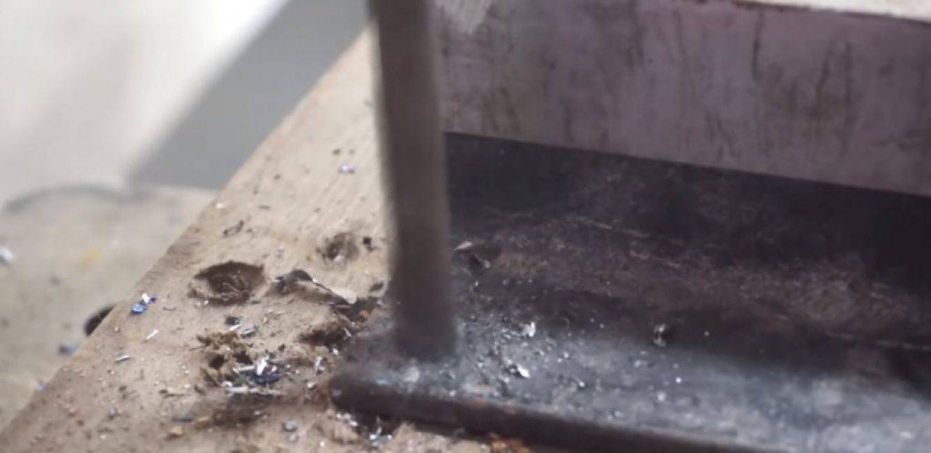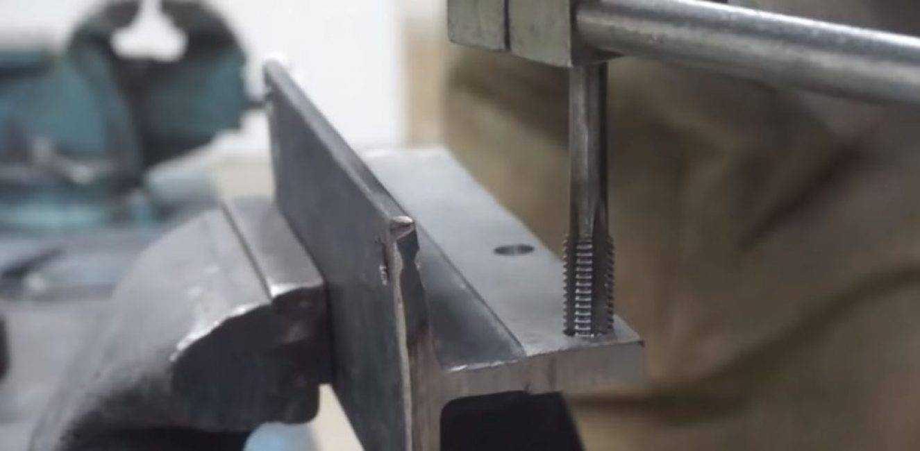 Сверлим в намеченных местах отверстия Ø10 мм и, зажав балку в тисках, мечиком нарезаем в отверстиях резьбу.