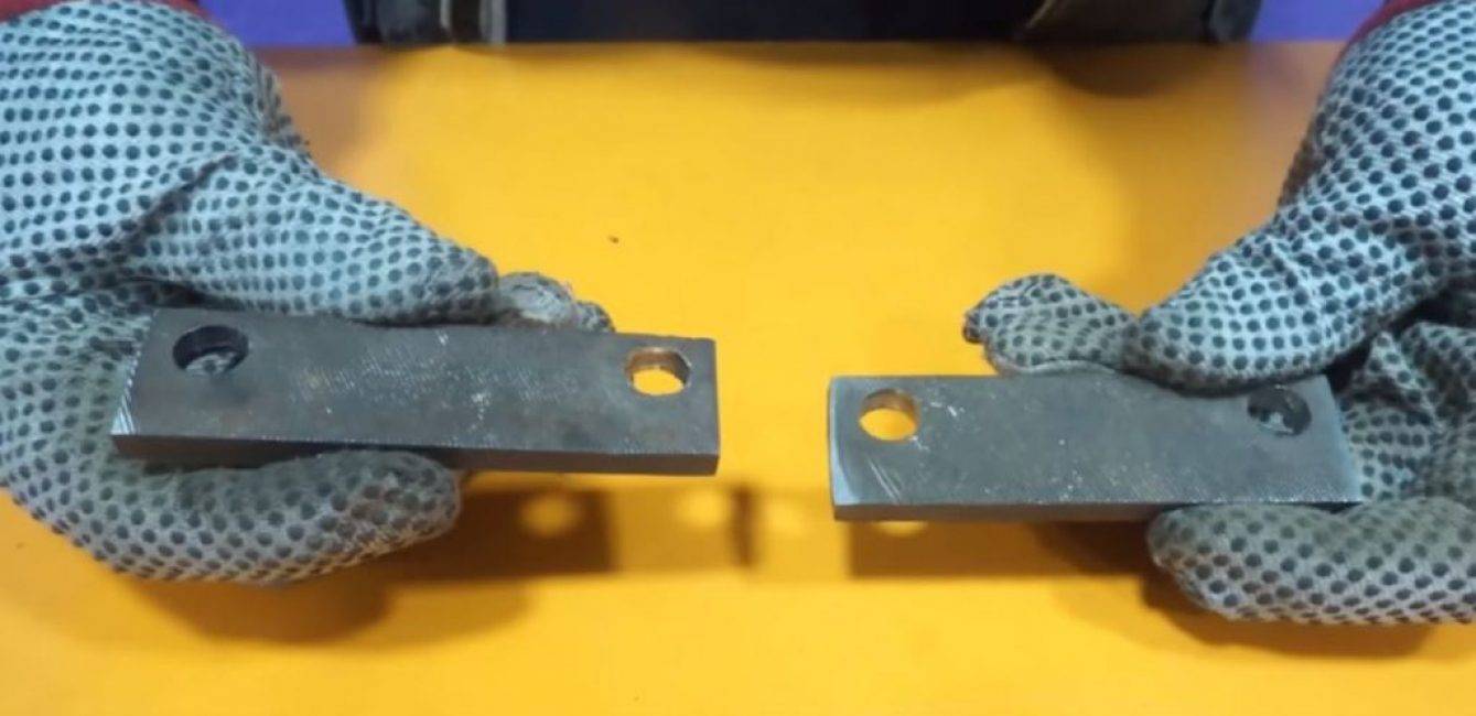 На краю узкой пластины делаем отверстие для крепления к рычагу. Примерно посередине длины этой пластины намечаем, просверливаем отверстия и нарезаем резьбу для крепления второго ножа так, чтобы его сточенные края выступали.