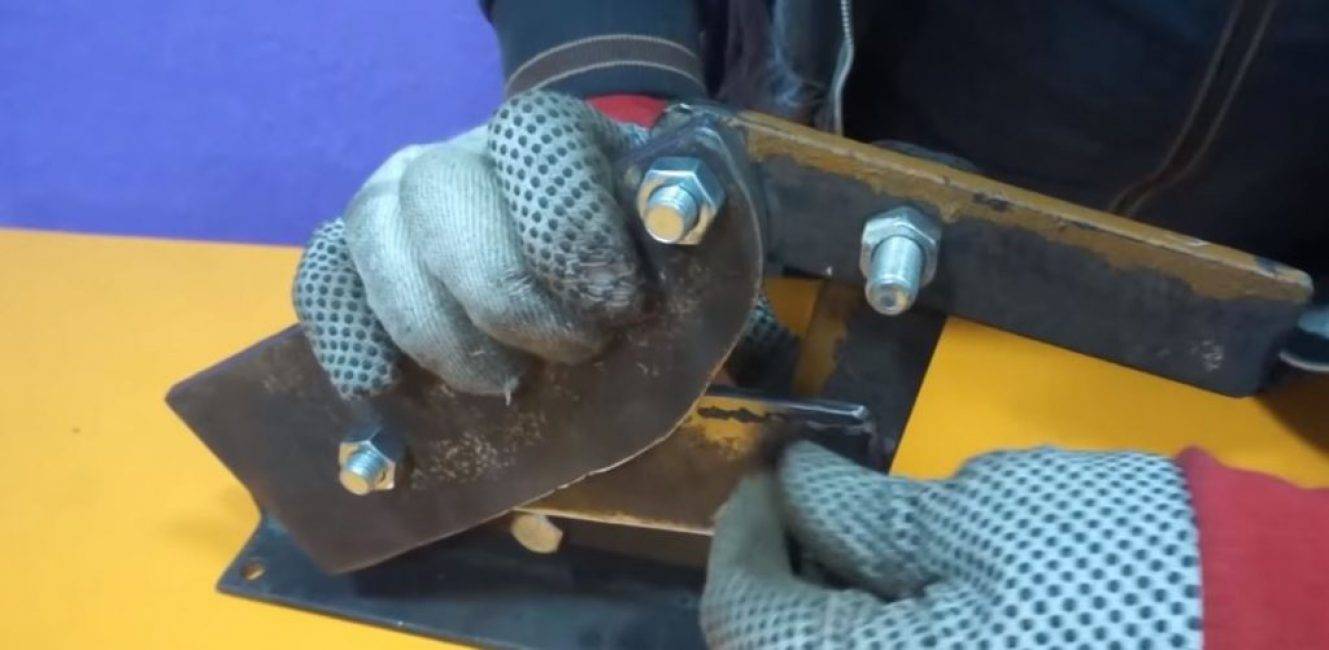 Из остатков стальной полоски вырезаем рычаг и перемычку. В рычаге и перемычке просверливаем по 2 отверстия. Одно отверстие рычага крепится к скругленной зафиксированной пластине, второе – через перемычку – к подвижному ножу. Крепим их с помощью болтов и гаек.