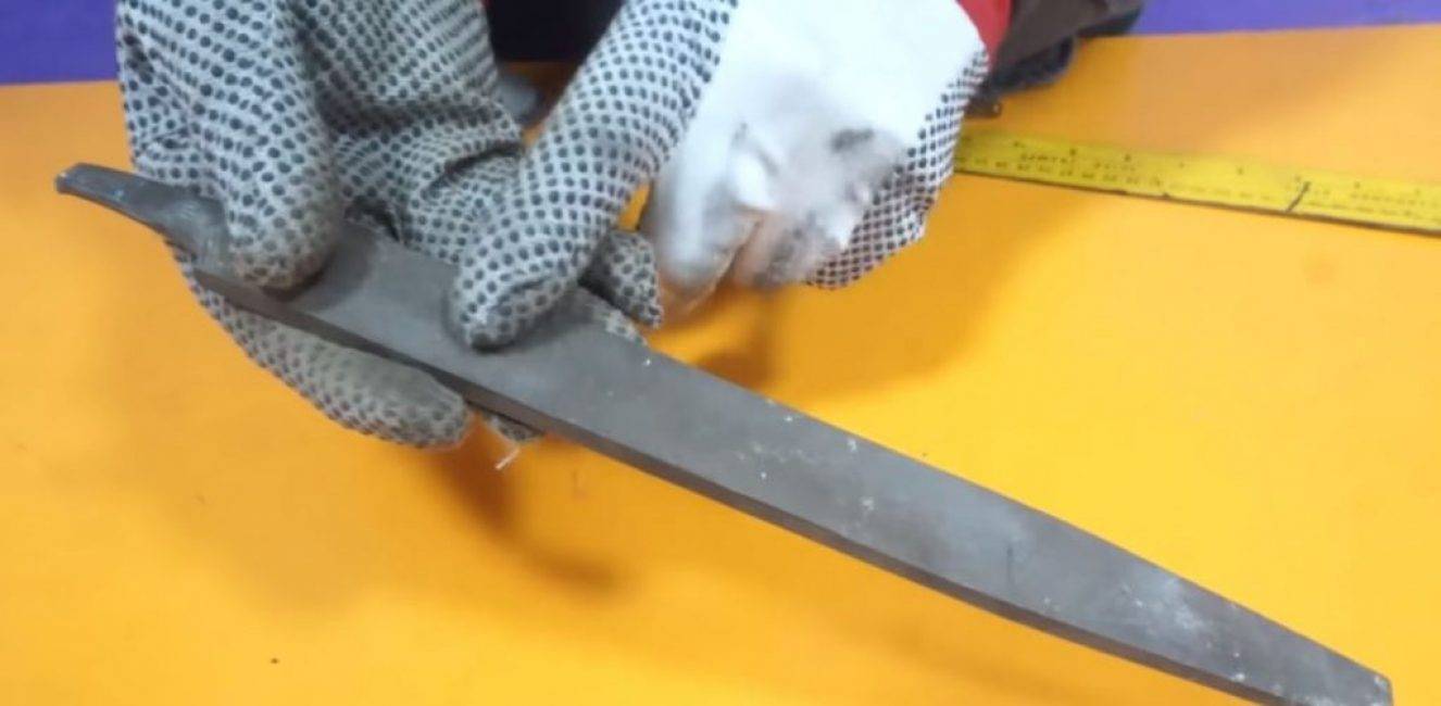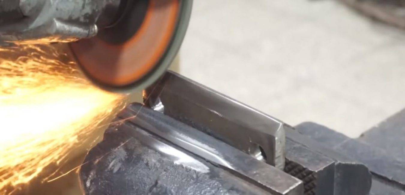 Отмеряем на нем два прямоугольника равной ширины и длиной по 10 см каждый. Зажимаем напильник в тисках и болгаркой вырезаем две одинаковые заготовки.