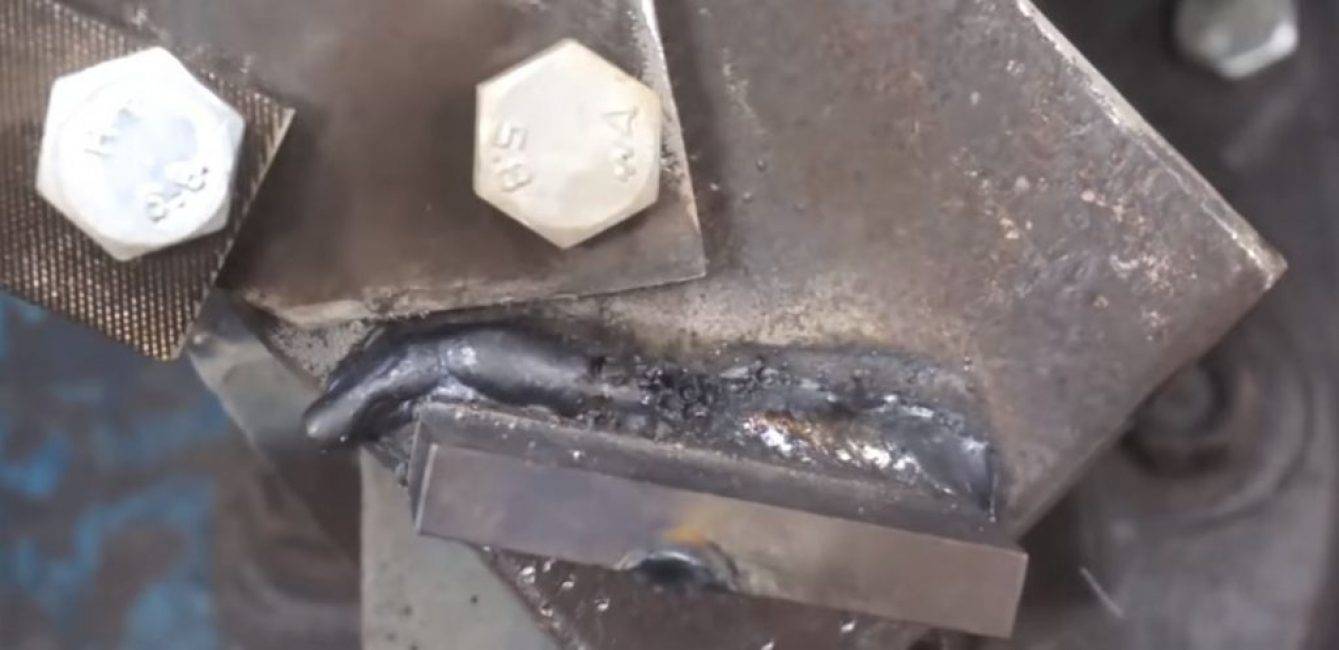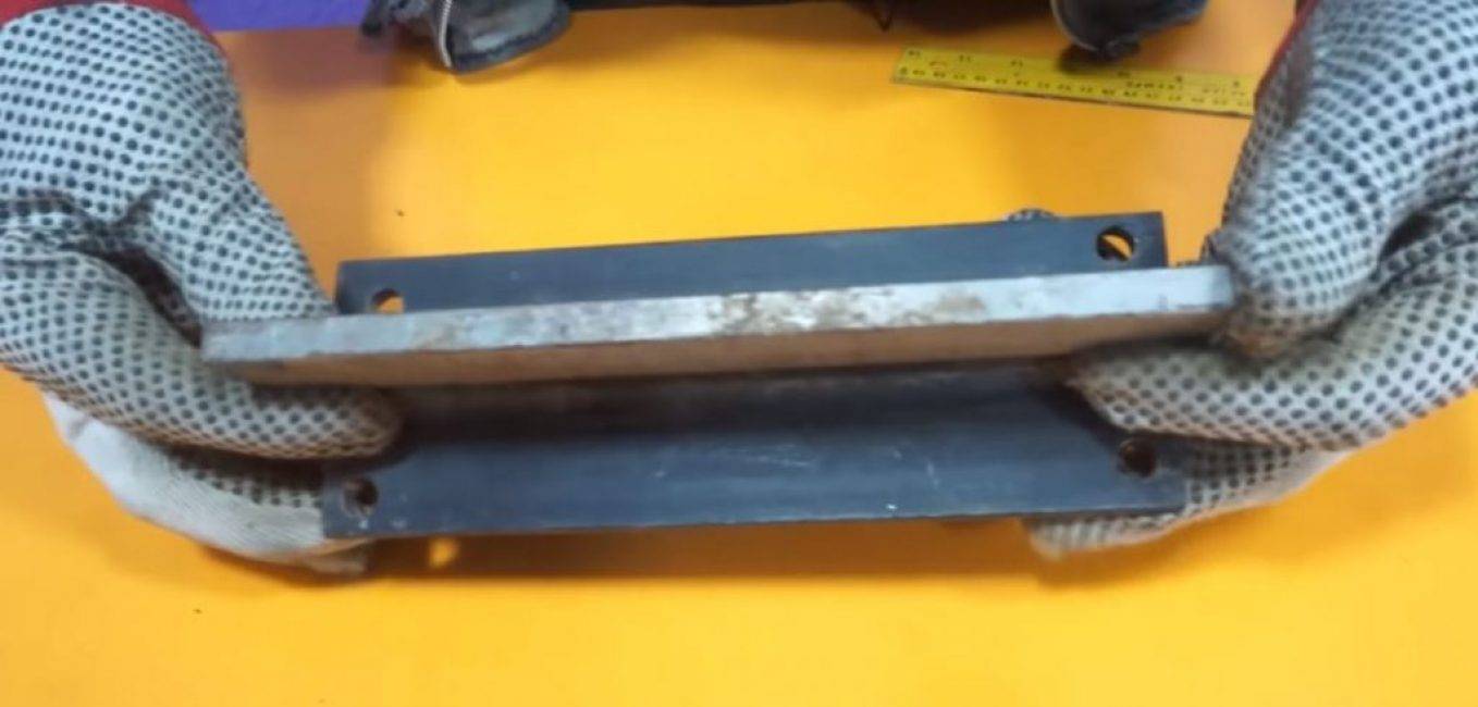 К верхней части балки привариваем небольшой кусочек стальной полоски для подгонки зазора между ножами.