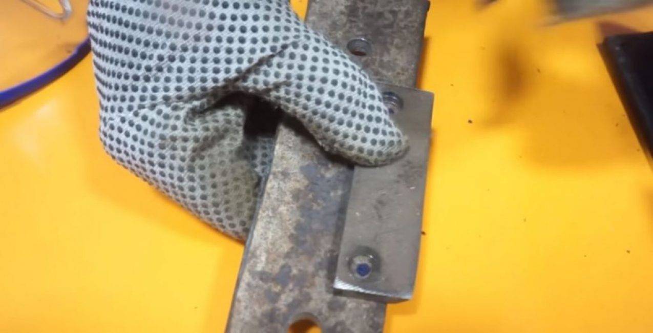 Прикрепляем один из ножей к балке, совместив соответствующие отверстия, и фиксируем его 2 болтами Ø10 мм. Выступающие части болтов срезаем.