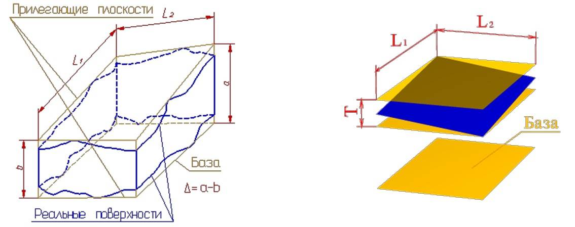Оценка соблюдения параметров плоскости осуществляется путём сравнения с характеристиками выбранной базой. Базой служит отдельный элемент детали, которые однозначно считают плоскими. Характер и расположение прямолинейного участка уточняется по результатам сравнения со своей базой. Каждый из разрешённых изменений обозначается установленным значком. В сноске к этому знаку указывают расположение и величину установленного отклонения. Допуск устанавливается для линий и плоскостей различного порядка. Все разрешённые изменения размеров объединяют единым полем. Общепризнанными изменения характера прямолинейности считаются выпуклость и вогнутость. Расположение и параметры отклонения от заданной плоскости обозначаются аббревиатурой (EFE). Для описания характеристик прямолинейности приняты показатели, входящие в единый комплект, обозначаемый (EFL).