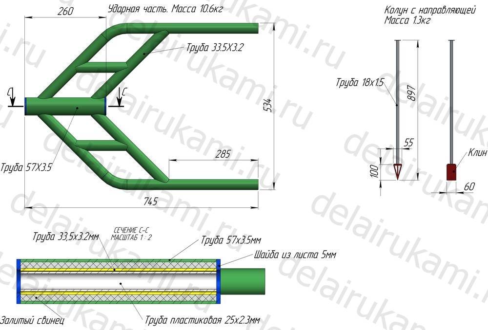 Лом-колун состоит всего из двух частей. Первая часть непосредственно колун с направляющей трубой, а вторая часть ударная. Ударная часть может быть наружной, то есть обхватывать собой направляющую трубу или внутренней – входить во внутрь направляющей трубы. Чтобы данный колун был эффективным, при его изготовлении нужно соблюсти одно правило. Часть колуна с направляющей и лезвием должна быть как можно легче, а ударная часть как можно тяжелее, но в разумных пределах, так как подымать ударную часть придется вручную. Чем больше разница по массе между эти двумя частями, тем выше КПД колуна.