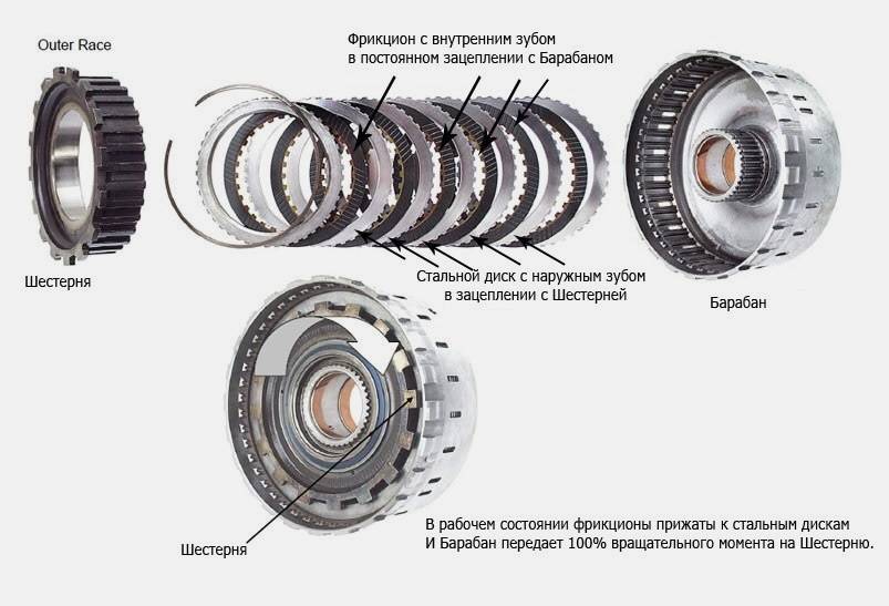 В АКПП используются барабаны торможения и сцепления, управляющие работой планетарного редуктора. В конструкции имеются муфты для: