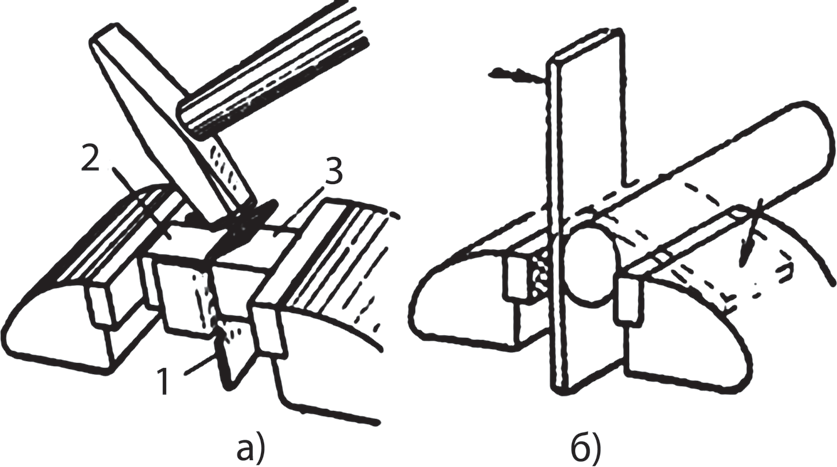 При выполнении гибки полок заготовку 1 (рис. 3, а) зажимают в тиски между двумя оправками 2 и 3 так, чтобы линия гибки была обращена в сторону загиба, на уровне верхней кромки оправки 3. Молотком ударяют по верхней полке детали 1. Ударять молотком нужно равномерно всей поверхностью бойка.