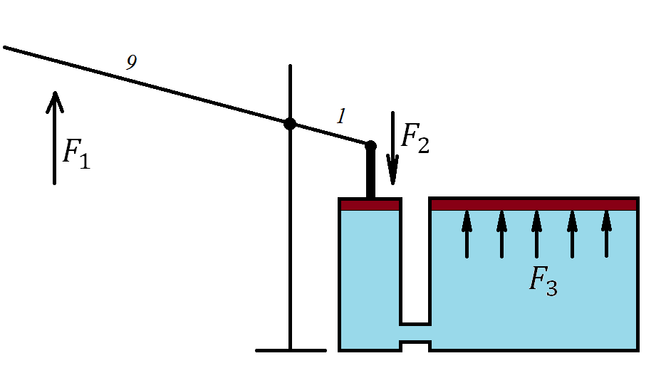 Здесь – длины плеч рычага, – силы, приложенные к плечам. Так как нам дано, что , то , то есть рычаг позволит нам давить на малый поршень с силой Н.