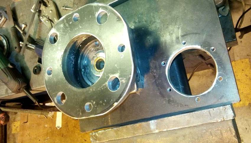 Фланец можно выполнить из автомобильной ступицы, обработав его на токарном станке. В металлической плите для установки гидроцилиндра нужно приварить круглую бобышку для фиксирования токарного станка в патроне. После растачивания отверстия плита приваривается к основанию рамы.