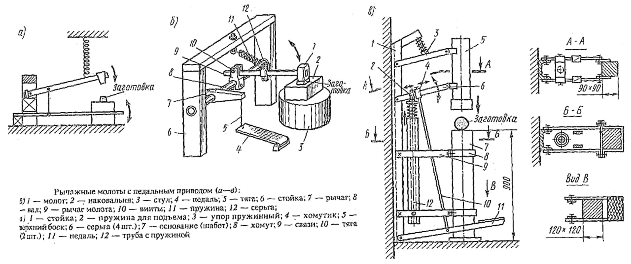 Кинематическая схема рычажного молота показана на поз. а) рис., а на поз. б) – устройство его традиционного типа. На поз. в) – устройство усовершенствованного рычажного молота: параллелограммная подвеска верхнего бойка (так в данном случае называется пуансон) на паре серег (качающихся рычагов) обеспечивает прямой удар, а перемещением хомута тяги (водила) по нижней серьге, как показано стрелками, точно регулируется сила удара. Пара пружин (нижняя – регулируемая) позволяет добиться механического безразличия бойка: в пределах рабочего хода он остается в любом положении, куда его поставят рукой; это дает возможность, не меняя веса бойка, точно регулировать запасаемую в нем кинетическую энергию. Такие рычажные молоты применяют даже ювелиры и яхтсмены – для установки в паруса мощных люверсов и сборки дельных вещей внатяг.