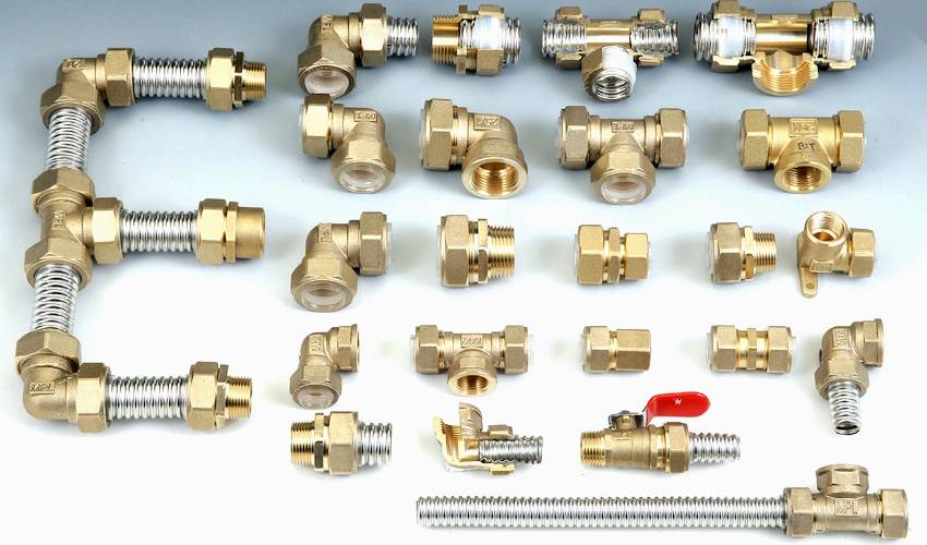 Для соединения отдельных частей инженерных коммуникаций между собой чаще всего используют латунные фитинги, которые, в зависимости от предназначения, могут иметь разный диаметр, форму сечения и конфигурацию. Состоят такие изделия из тела, накидной гайки, пластикового или стального кольца-стопора и силиконовой прокладки, герметично обжимающей гибкую трубу.
