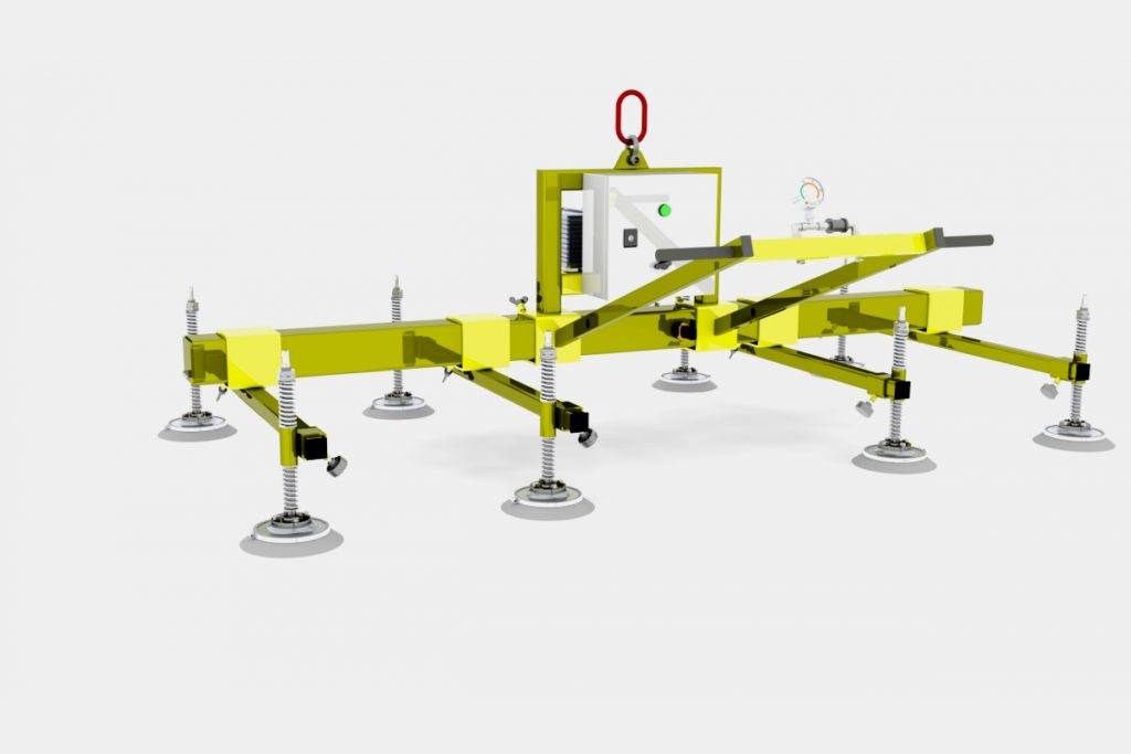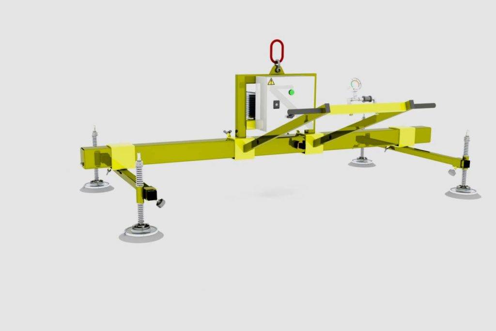 Эта конструкция относится к категории вакуумных. Применяется для захвата и последующей транспортировки ровного воздухонепроницаемого листового материала. Его максимальные габариты составляют 150х300 см. Для подвешивания применяется установленный крановый крюк. Отличное решение для обустройства складских линий, в которых осуществляется плазменная или лазерная резка. По мнению покупателей, следует отметить, что конструкция поставляется в собранном виде и может использоваться сразу по завершению монтажа. За повышенное удобство в последующем пользовании отвечает установленная интеллектуальная электронная система мониторинга. Заявленный коэффициент грузоподъемности составляет 350 кг. Вес – 100 кг.