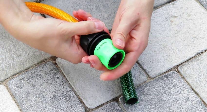 Соединение двух элементов шланга посредством быстросъема выполняется без использования инструмента. Перед тем как соединить два шланга для полива одного диаметра, следует отжать на муфте стопорную втулку в сторону адаптера. Муфта вставляется в ниппель, что осуществляется благодаря отхождению зажимных шариков. Далее выполняется разжим муфты, это создаст надежную фиксацию в ниппеле втулки. Обратные клапаны после соединения откроются, что будет способствовать свободному движению по шлангам рабочей среды.