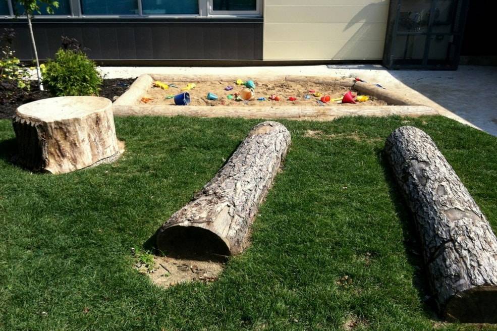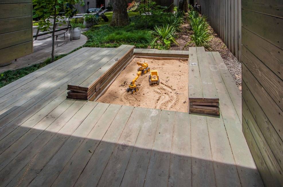 Незаменимый элемент, который должен обязательно присутствовать – песочница. Особенно это актуально для самых маленьких хозяев. Именно там, малыши любят ковыряться, создавать свои шедевры из песка. Игры с песочными фигурками хорошо развивают мелкую моторику у детей. Подрастая, начинающие строители смогут сооружать здесь песочные замки и прочее.