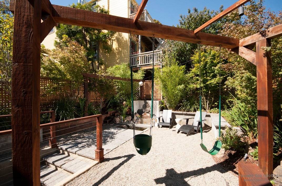 Качели как дополнительный элемент зоны отдыха понравятся не только детям, но и взрослым: тем более широкие могут использоваться как лавка или лежак.