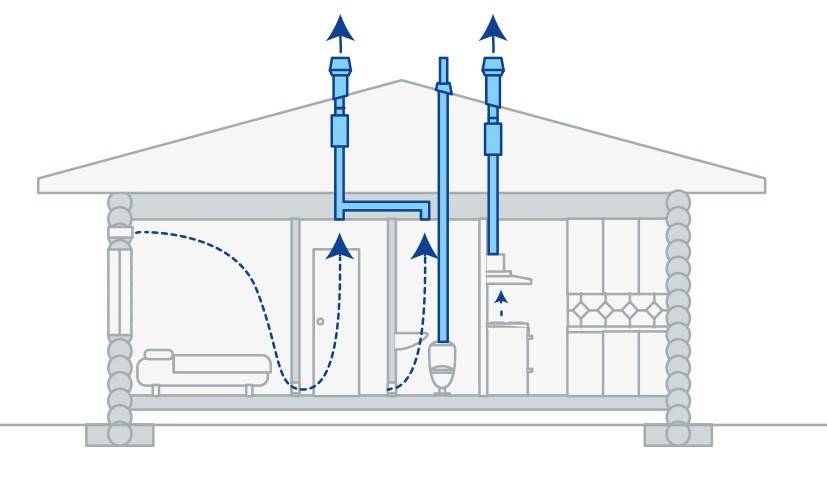 Душевая и туалетная комнаты оборудуются системой воздуховодов. При использовании в теплое время года достаточно сделать дополнительное вентиляционное окошко либо выпустить вентиляционную трубу наверх за уровень кровли.