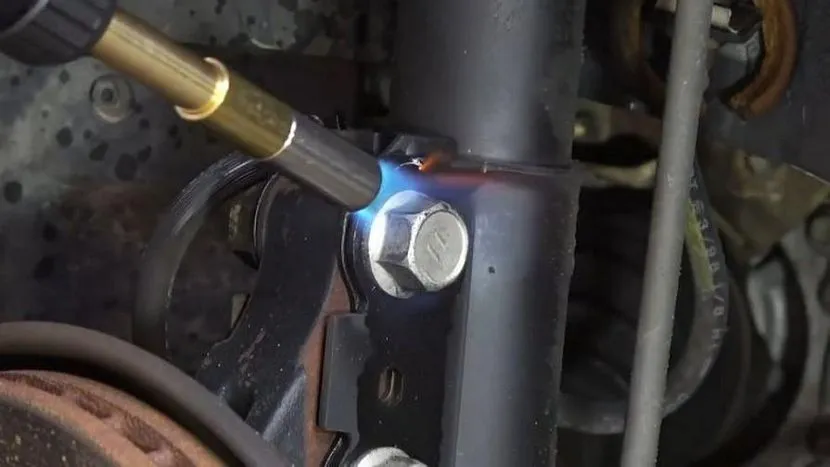 Когда растворитель не справляется с задачей, можно попробовать воздействие огнем и холодом. В любом крупном авто или хозяйственном магазине продается газовая горелка, с ее помощью нагревают болт до ярко-оранжевого цвета. Потом охлаждают машинным маслом и пытаются его ослабить. При неудачной попытке процесс повторяют заново.