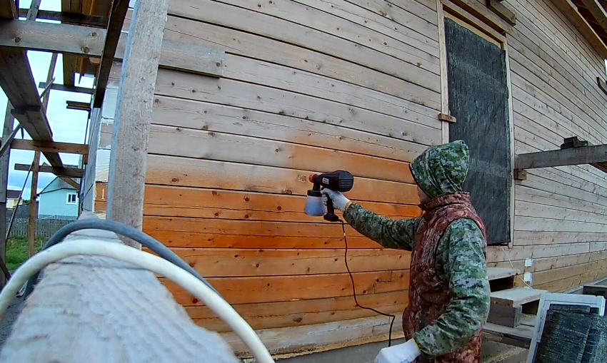 Первым делом стены обрабатываются антисептическими препаратами, которые защищают древесину от грибка, гнили, плесени, древоточцев, и противопожарными веществами, улучшающими защитные характеристики постройки.
