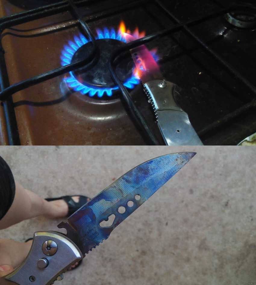 Принципиального различия между данными способами не существует. Главное — поместить нож или другое изделие в печь или костер и следить за его температурой.