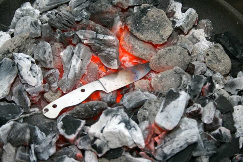 Процедура закаливания – обязательный этап при изготовлении изделия. Приступать к нему следует после того, как клинку задали нужную форму в процессе отжига. Эта манипуляция призвана снизить твердость детали для того, чтобы можно было следовать наброску будущего лезвия. Однако нож