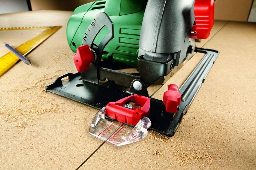 На передней части (торце) платформы каждой ручной циркулярки есть риска-выемка. Она располагается напротив диска и показывает, куда будет идти пропил. Риску совмещают с разметкой пропила и пилят, следя за тем, чтобы риска шла по разметке.