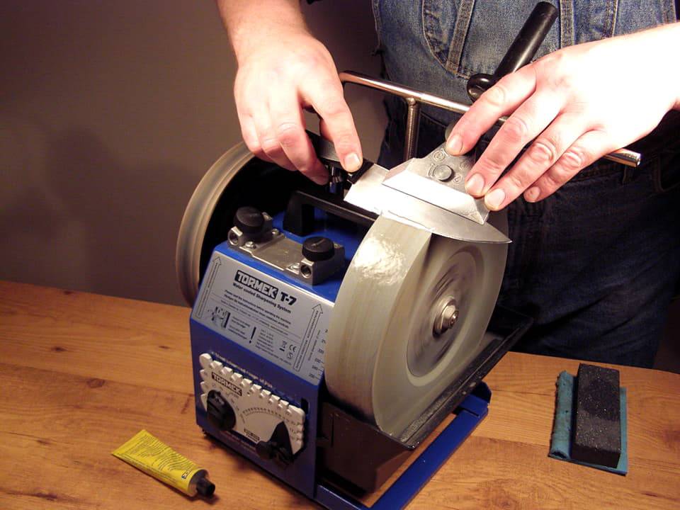 Твёрдость получившегося ножа составит 60-62 единицы по шкале Роквелла. Убедившись в симметричности спусков, можно приниматься за заточку. Процесс начинается с грубого точильного бруска с крупным зерном. Профессионалы советуют использовать алмазные камни для заточки ножей.