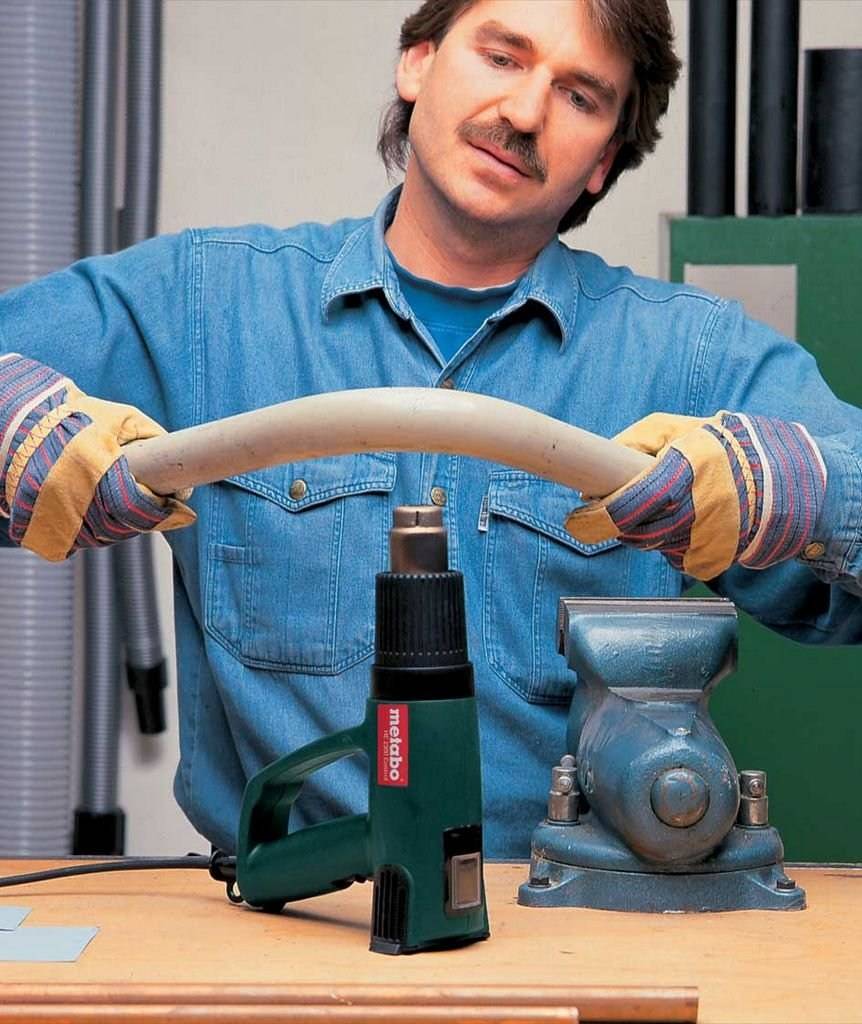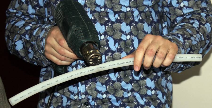 Тонкие пластиковые трубы часто ломаются при попытке сгиба, поэтому нужно прогреть место планируемого сгиба строительным феном до температуры порядка 180-200 градусов и аккуратно произвести сгиб. Это произойдет легко и быстро, достаточно лишь зафиксировать готовый изгиб и дождаться, когда труба остынет.