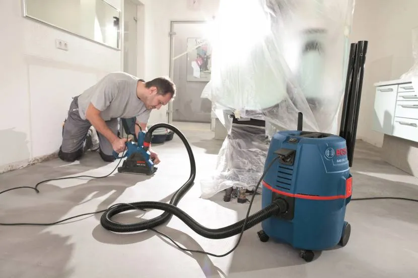 Мощность − 1,5 кВт. В комплекте идут сменные диски. При использовании строительного пылесоса отлично решается проблема пыли. Присутствует система электронного управления пуском, защита от заклинивания. Имеет один недостаток – слегка тяжеловат, вес − 5,9 кг.