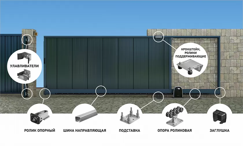 Автоматика на ворота для сдвижения полотна может использовать устройства заводского производства. Оно будет включать в себя такие элементы: