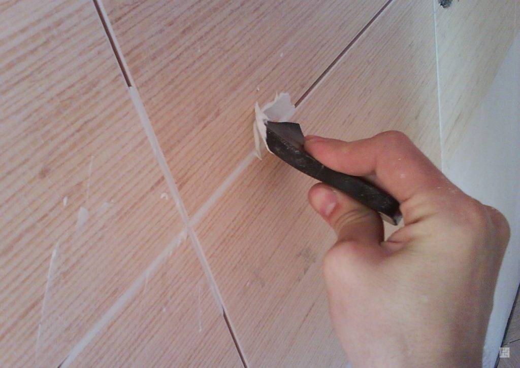 Обрабатывать швы начинают с дальнего угла комнаты. Шпателем заполняются щели между швами. Удаляются остатки затирочной смеси.