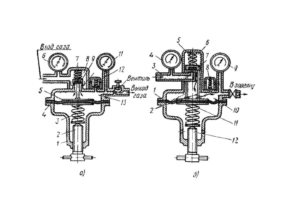 Редуктор обратного действия (рис. 1 а) работает следующим образом. Сжатый газ из баллона поступает в камеру высокого давления 8 и препятствует открыванию клапана 9. Для подачи газа в горелку или резак необходимо вращать по часовой стрелке регулирующий винт 2, который ввертывается в крышку 1. Винт сжимает нажимную пружину 3, которая в свою очередь выгибает гибкую резиновую мембрану 4 вверх. При этом передаточный диск со штоком сжимает обратную пружину 7, поднимая клапан 9, который открывает отверстие для прохода газа в камеру низкого давления 13. Открыванию клапана препятствует не только давление газа в камере высокого давления, но и пружина 7, имеющая меньшую силу, чем пружина 3. Автоматическое поддержание рабочего давления на заданном уровне происходит следующим образом. Если отбор газа в горелку или резак уменьшится, то давление в камере низкого давления повысится, нажимная пружина З сожмётся и мембрана 4 выправится, а передаточный диск со штоком 5 опустится и редуцирующий клапан 9 под действием пружины 7 прикроет седло клапана 10, уменьшив подачу газа в камеру низкого давления. При увеличении отбора газа процесс будет автоматически повторяться. Давление в камере высокого давления 8 измеряется манометром 6, а в камере низкого давления 13 — манометром 11. Если давление в рабочей камере повысится сверх нормы, то при помощи предохранительного клапана 12 произойдет сброс газа в атмосферу.