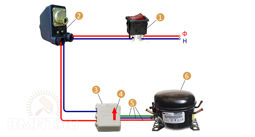 Важно установить пусковое реле в правильное положение — по стрелке на его крышке, иначе устройство не будет правильно работать. 1 — тумблер; 2 — реле давления; 3 — пусковое реле компрессора; 4 — стрелка положения реле; 5 — подключение реле к обмоткам компрессора; 6 — компрессор. 1 — тумблер; 2 — реле давления; 3 — пусковое реле компрессора; 4 — стрелка положения реле; 5 — подключение реле к обмоткам компрессора; 6 — компрессор