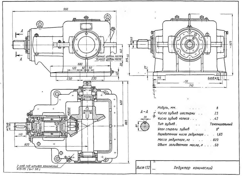 Редуктор конический с вертикальным быстроходным и горизонтальным тихоходным валами — крупный тяжелонагруженный с циркуляционной системой смазывания. Для облегчения монтажа подшипникового узла быстроходного вала и посадки шестерни на вал корпус выполнен с двумя разъемами.