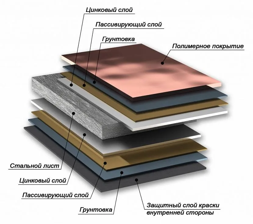 Так как сама выполняющая защиту оцинковка не слишком устойчива к внешним влияниям, склонна вступать во взаимодействие с молекулами воздуха и «выветриваться» естественным образом, то поверх нее устраивают полимерный слой. Он и защищает оцинковку от разрушения, и окрашивает покрытие в разнообразные цвета.