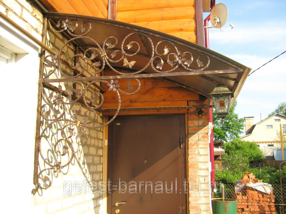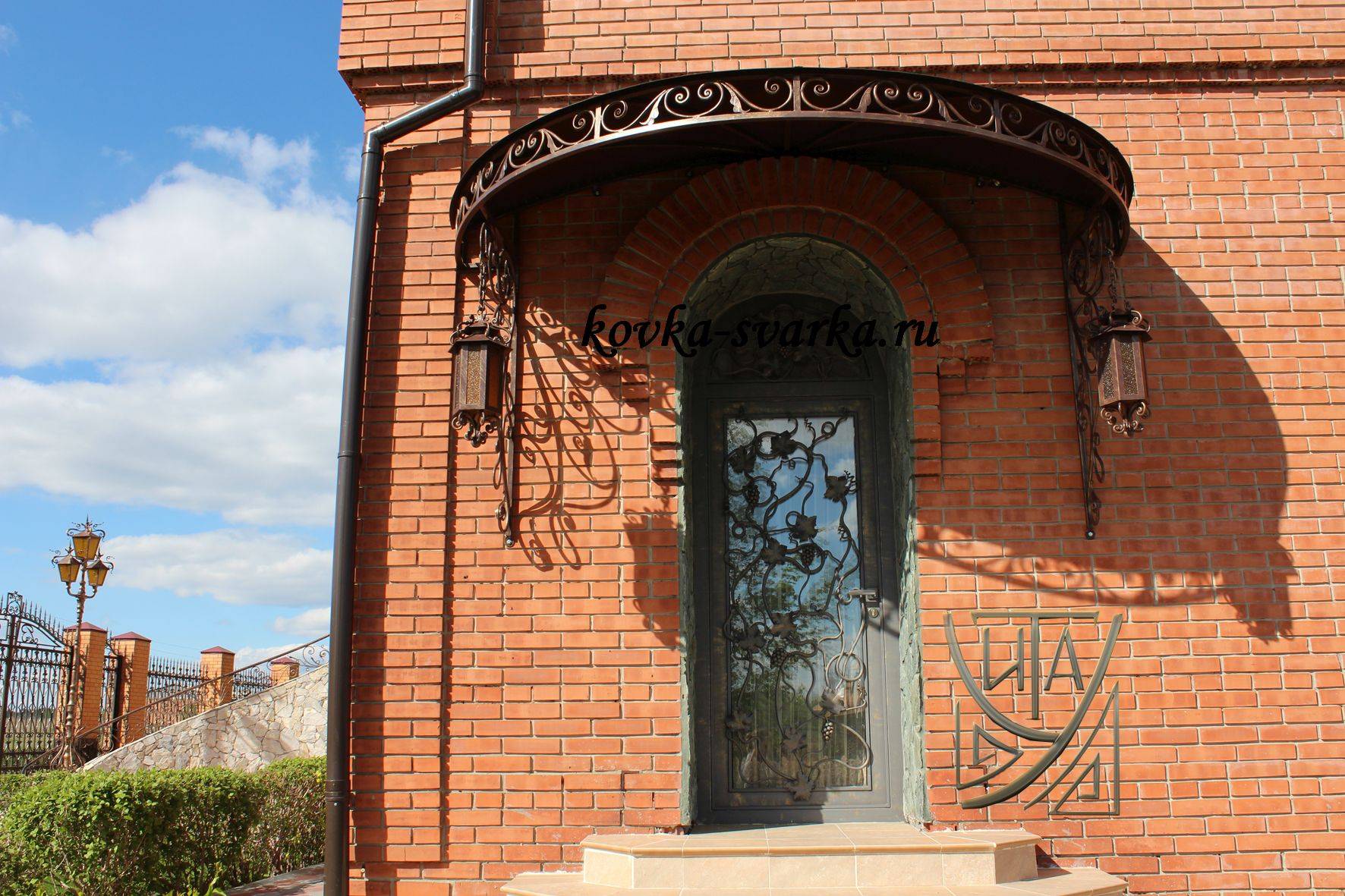 Кованые козырьки над входом — конструкции, которые могут располагаться не только над дверью стандартных размеров, но и над гаражными дверями, калитками, воротами, крыльцами. То есть изделия, служащие для оформления входов различных форм и габаритов.