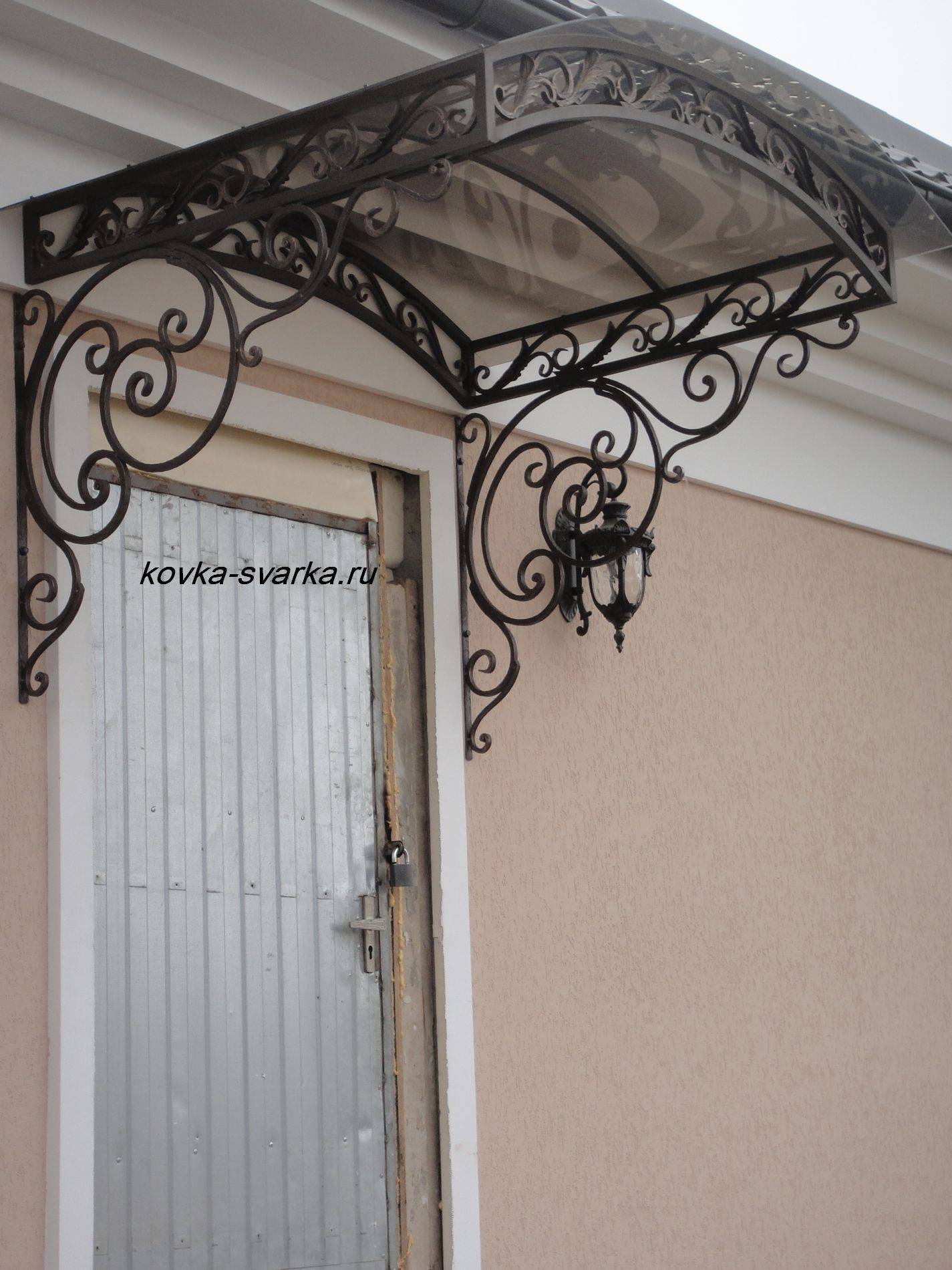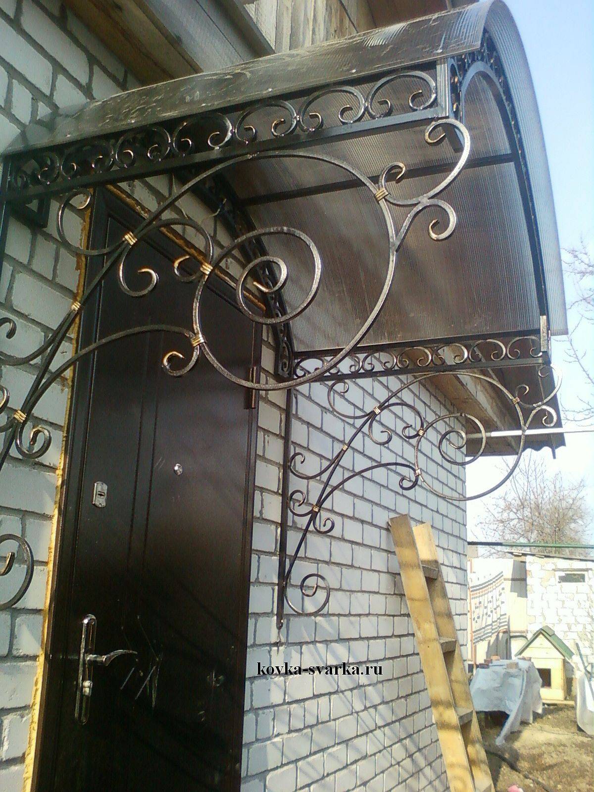 Подобный вариант по праву считается самым эффектным. Козырек станет подлинным украшением всего здания, прослужит без проблем своему владельцу на протяжении долгих лет. Ковка – дорогое удовольствие, поэтому средняя стоимость изделия превысит 30 тысяч рублей. Кованая основа прекрасно сочетается со всеми материалами, применяемыми при изготовлении козырьковых конструкций
