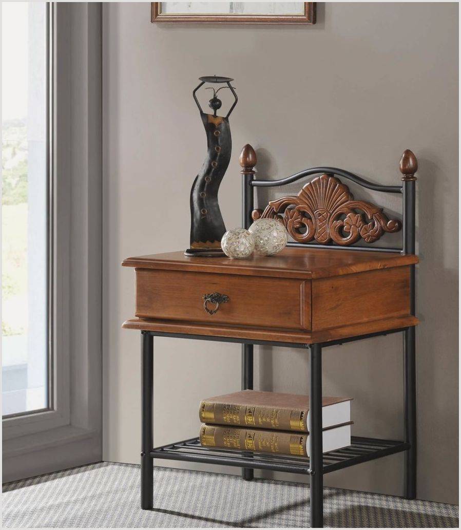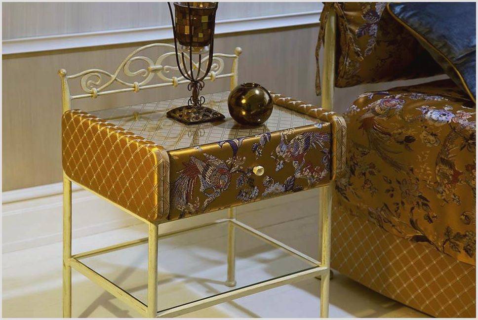 - Миниатюрные кованые экземпляры мебели могут располагаться возле кроватей в качестве тумбочек. Для хранения мелочей в них предусмотрены розетки, корзины или ящички.