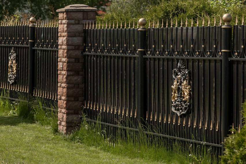 - Равное соотношение кирпича и металла. При этом нижняя часть ограждения (1-1,5 м) и столбы выполняются из кирпича, а между колоннами располагаются кованые элементы.