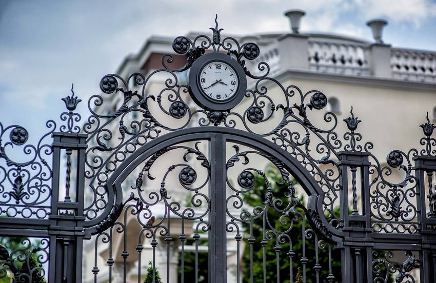Требуется заранее подобрать подходящие ворота для кованого забора. Они могут быть разных видов, но наиболее популярными являются распашные и откатные створки. Устанавливая забор, стоит запомнить, что он не должен располагаться в непосредственной близости к дороге. Минимальная дистанция в этом случае составляет 1,5 м.