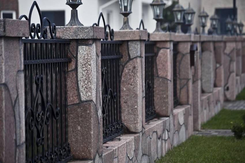 Комбинирование камня, ковки и профнастила — удачное решение для создания красивого и надежного забора