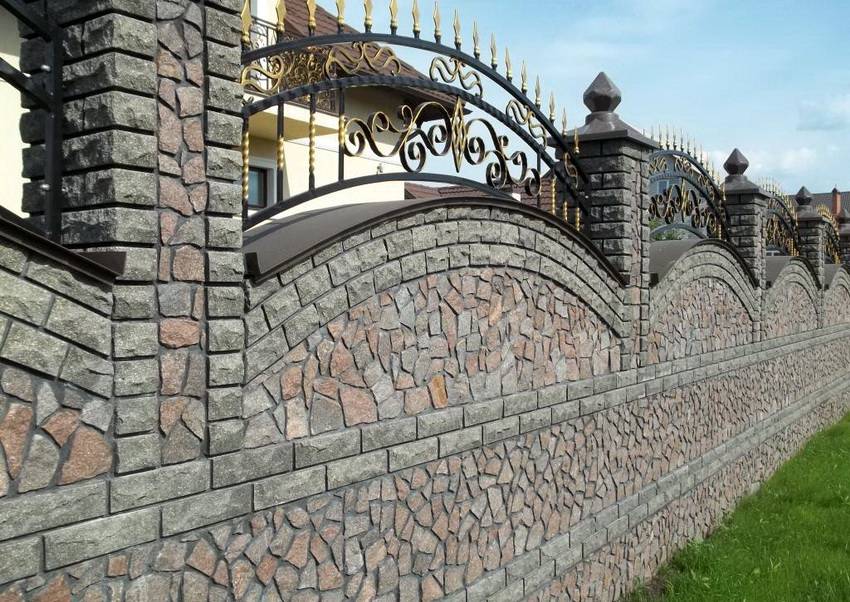 - Забор с полукруглой ковкой. Наиболее интересный и художественный вариант. Нижняя часть (1-1,5 м) и столбы выкладываются из камня, а пролеты представлены в виде полукруглых секций из металлических элементов.